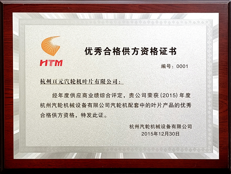 2015年优秀合格供方资格证书